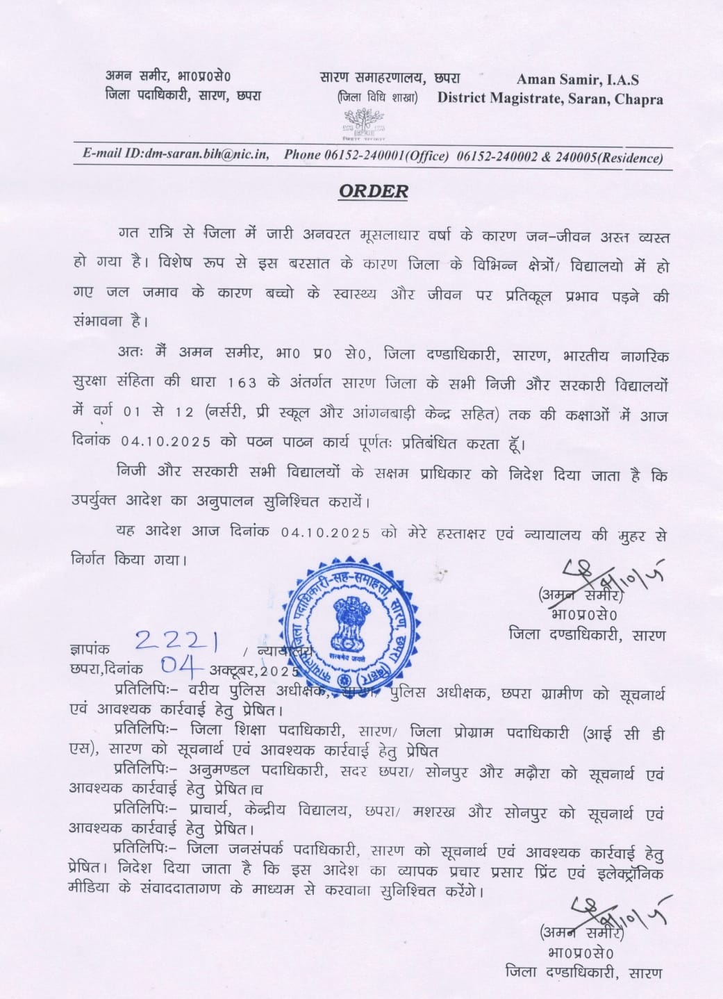 बारिश के कारण सड़कों पर बाढ़ जैसे हालात हैं. जिसे लेकर सुरक्षा के दृष्टिकोण से एहतियात बरतते हुये जिला दंडाधिकारी सह जिलाधिकारी अमन समीर द्वारा जिला के सभी विद्यालयों एवं आंगनबाड़ी केंद्रों को आज Saturday के लिये बंद रखने का आदेश दिया गया है.