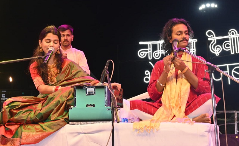 प्रधानमंत्री नरेन्द्र मोदी के हाथों वर्ष 2024 के कल्चरल एम्बेसडर ऑफ द ईयर के पुरस्कार से सम्मानित मैथिली ठाकुर ने भजनों की शुरुआत माँ नर्मदा के जयघोष से और मॉं नर्मदा की स्तुति में त्वदीय पाद पंकजम नमामि देवी नर्मदे के गायन से की. इसके बाद उन्होंने अपनी कर्ण प्रिय आवाज में राम को देखकर जनक नन्दिनी बाग में जा खड़ी की खड़ी रह गयी तुम उठो सिया सिंगार करो, शिव धनुष राम ने तोड़ा है राधिका गोरी से बिरज की छोरी से मैया करा दे मेरो ब्याह मीठे रस से भरयोरी राधा-रानी लागे, मने खारो खारो जमना जी रो पानी लागे राधे-राधे जप चले आएंगे Biharी ‘’रामा राम रटते-रटते बीती रे उमरिया’’ और ‘’मेरी झोपड़ी के भाग्य आज खुल जायेंगे, राम आयेंगे’’ जैसे भजन प्रस्तुत कर भगवान राम और कृष्ण की भक्ति की जो सरिता बहाई, श्रोता उसमें डूबते चले गये.